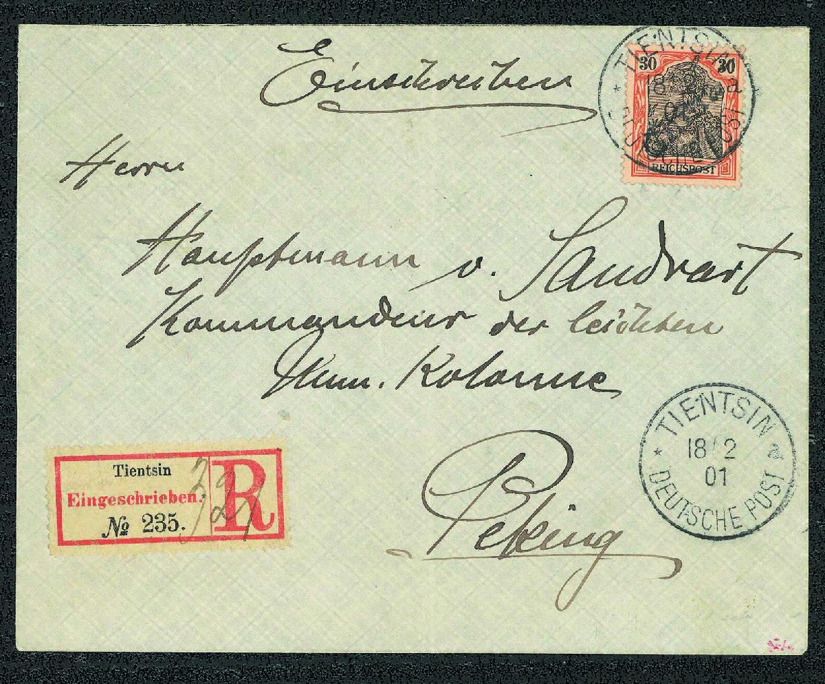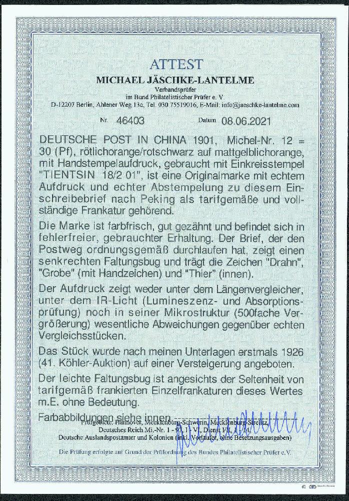 | Zusatzinformationen und Suchstichworte: | Gert Müller 119. Auktion 24. - 26. August 2023 Los 4315 Deutsche Auslandspost China DIE EINZELFRANKATUR DER 30 PFG. HANDSTEMPEL: 30 Pfg. Germania-Reichspost mit Handstempel "CHINA", farbfrisches Luxusstück als traumhaft schöne, exakt portogerechte Einzelfrankatur auf sehr schönem gef. Einschreibebrief mit zwei klaren K1 "TIENTSIN 18.2.01." nach Peking mit Ankunftsstempel. Es ist nur ein weiterer Einschreibebrief mit einer Einzelfrankatur bekannt geworden, wobei es sich bei dem hier angebotenen Stück um das schönere Exemplar handelt. Eine der großen Raritäten der Deutschen Post in China, erstmalig im Jahr 1926 auf der 41. Köhler-Auktion angeboten. Zwei Fotoatteste "ECHT UND FEHLERFREIE ERHALTUNG" von 2008 bzw. 2021 Jäschke-Lantelme BPP Ausruf 20.000,00 EUR |