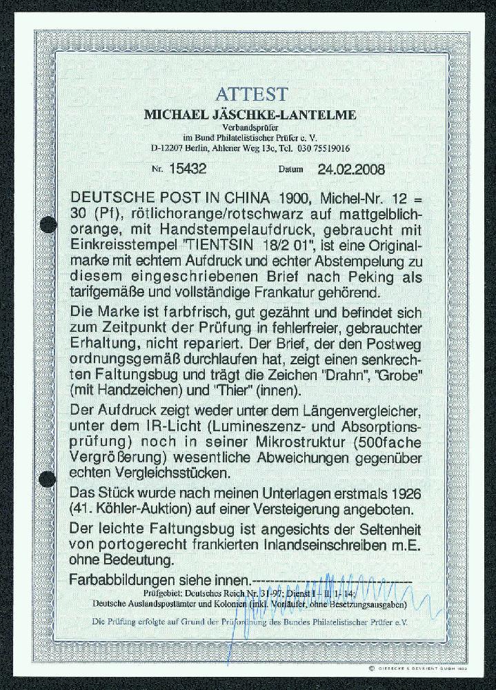 | Zusatzinformationen und Suchstichworte: | Gert Müller 119. Auktion 24. - 26. August 2023 Los 4315 Deutsche Auslandspost China DIE EINZELFRANKATUR DER 30 PFG. HANDSTEMPEL: 30 Pfg. Germania-Reichspost mit Handstempel "CHINA", farbfrisches Luxusstück als traumhaft schöne, exakt portogerechte Einzelfrankatur auf sehr schönem gef. Einschreibebrief mit zwei klaren K1 "TIENTSIN 18.2.01." nach Peking mit Ankunftsstempel. Es ist nur ein weiterer Einschreibebrief mit einer Einzelfrankatur bekannt geworden, wobei es sich bei dem hier angebotenen Stück um das schönere Exemplar handelt. Eine der großen Raritäten der Deutschen Post in China, erstmalig im Jahr 1926 auf der 41. Köhler-Auktion angeboten. Zwei Fotoatteste "ECHT UND FEHLERFREIE ERHALTUNG" von 2008 bzw. 2021 Jäschke-Lantelme BPP Ausruf 20.000,00 EUR |