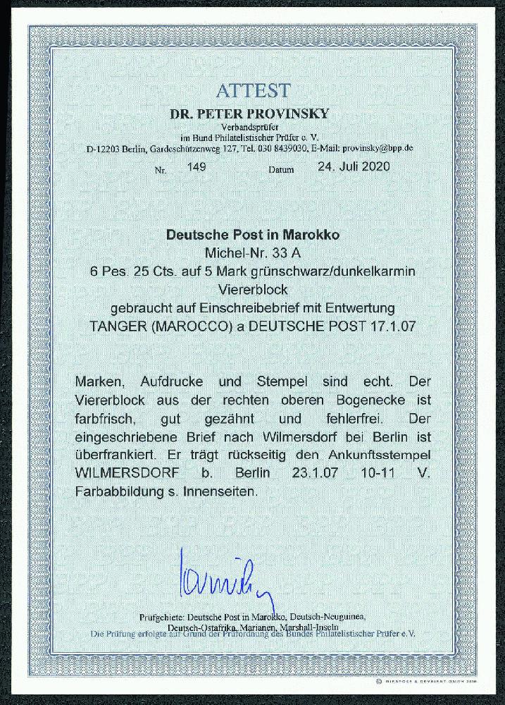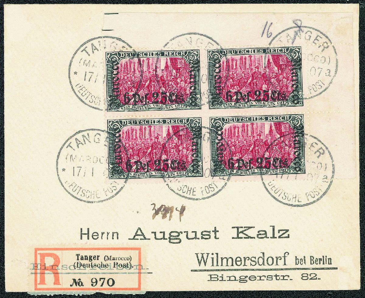 | Zusatzinformationen und Suchstichworte: | Gert Müller 119. Auktion 24. - 26. August 2023 Los 4351 Deutsche Auslandspost Marokko 6 Pes. 25 Cts. auf 5 Mk. grünschwarz/dunkelkarmin, ein traumhaft schöner Viererblock aus der rechten oberen Bogenecke auf dekorativem Einschreibebrief mit klarem K1 "TANGER DEUTSCHE POST 17.1.07." nach Wilmersdorf bei Berlin mit Ankunftsstempel. Ein sehr attraktiver Brief mit einer seltenen Einheit des Höchstwertes! Fotoattest Dr. Provinsky BPP Ausruf 1.000,00 EUR |