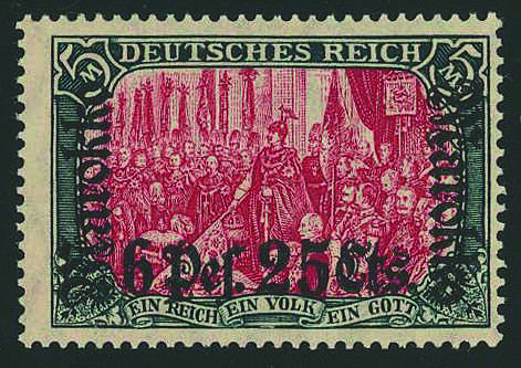 | Zusatzinformationen und Suchstichworte: | Gert Müller 119. Auktion 24. - 26. August 2023 Los 4357 Deutsche Auslandspost Marokko 6 Pes. 25 Cts. auf 5 Mk. grünschwarz/dunkelkarmin, Friedensdruck, 26:17 Zähnungslöcher, Aufdruck rußig, tadellos postfr. Luxusstück ohne jegliche Signaturen, Fotobefund "FEHLERFREIE POSTFRISCHE ERHALTUNG" Jäschke-Lantelme BPP Ausruf 150,00 EUR |