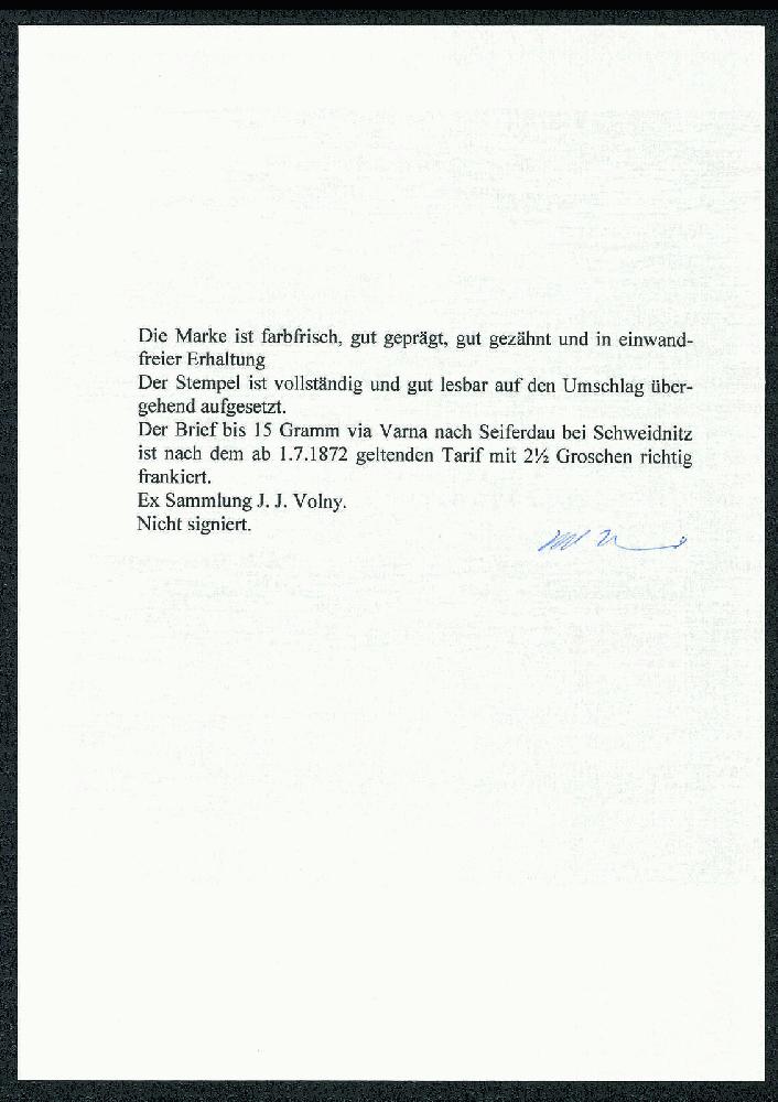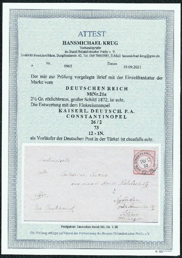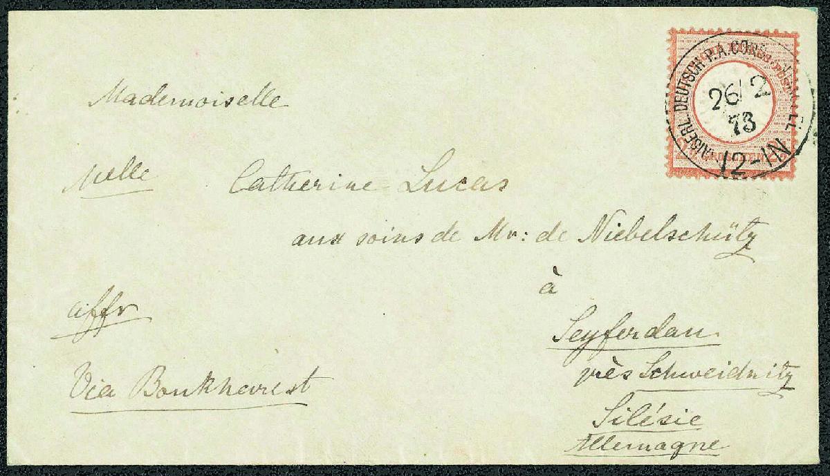 | Zusatzinformationen und Suchstichworte: | Gert Müller 119. Auktion 24. - 26. August 2023 Los 4358 Deutsche Auslandspost Türkei, Vorläufer 2 1/2 Gr. rötlichbraun, großer Schild, farbfrisches Luxusstück auf wunderschönem kleinformatigem Brief mit zentrischem klarem K1 "CONSTANTINOPEL KAISERL. DEUTSCH P.A. 26.2.73." mit handschriftlichem Leitvermerk "VIA BOUKHAREST", befördert "VIA VARNA" nach Seyferdau bei Schweidnitz mit rückseitigem Ausgabestempel. Ein wundervoller Brief für höchste Ansprüche! Ausruf 800,00 EUR |