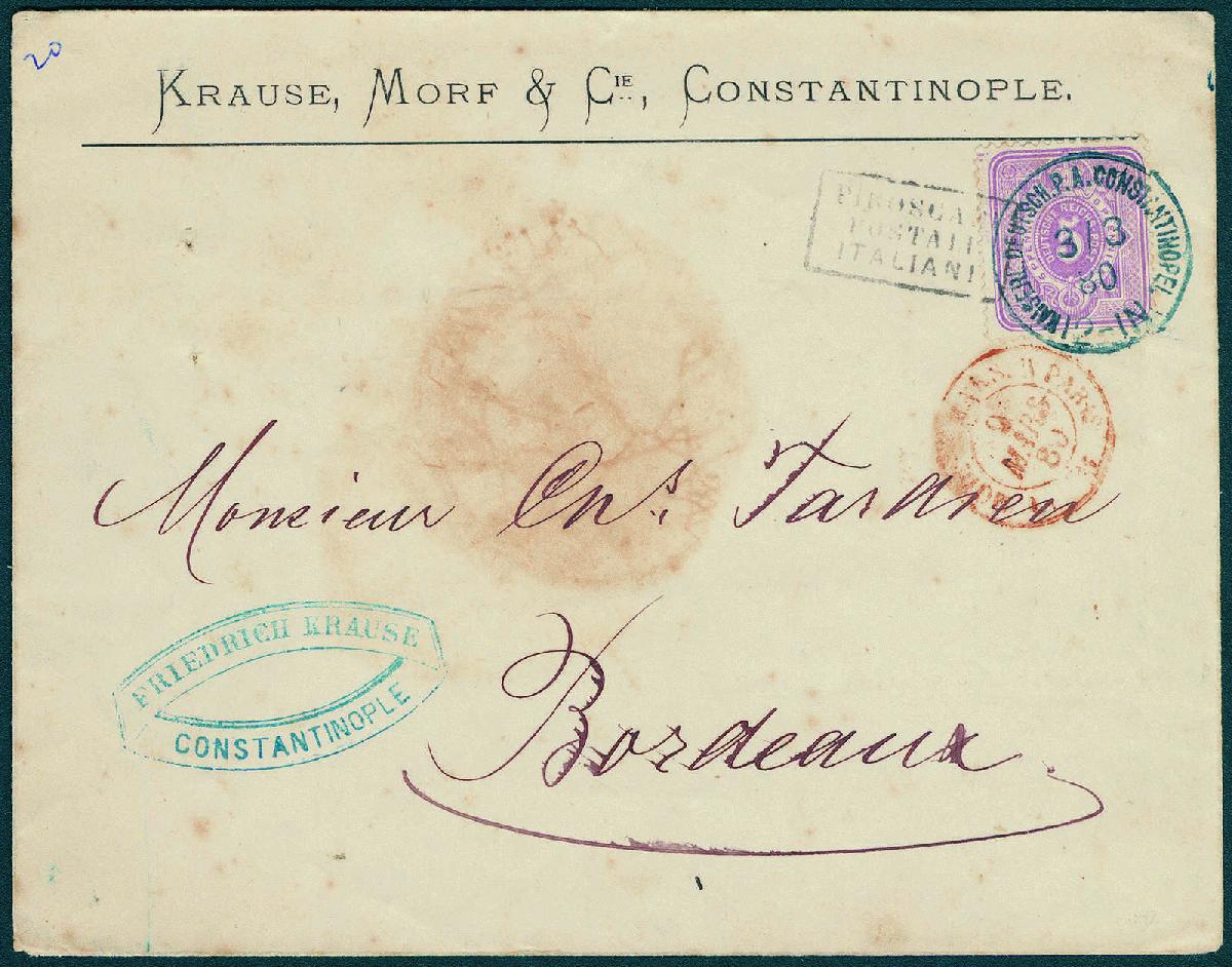 | Zusatzinformationen und Suchstichworte: | Gert Müller 119. Auktion 24. - 26. August 2023 Los 4362 Deutsche Auslandspost Türkei, Vorläufer 5 Pfennige lebhaftgraupurpur, farbfrisch auf portogerecht frankierter Drucksache, minimal fleckig, nach Bordeaux/Frankreich mit klarem blauem K1 "KAISERLICH DEUTSCH P.A.CONSTANTINOPEL 3.3.80" mit Transitstempel von "BRINDISI 7.3.80.". Aus der Vorläufer-Zeit sind Drucksachen ins Ausland gelaufen bereits extrem selten, in dieser Form mit dem seltenen blauen Stempel eine Rarität dieses Gebietes! Fotoattest Jäschke-Lantelme BPP Ausruf 1.500,00 EUR |