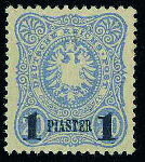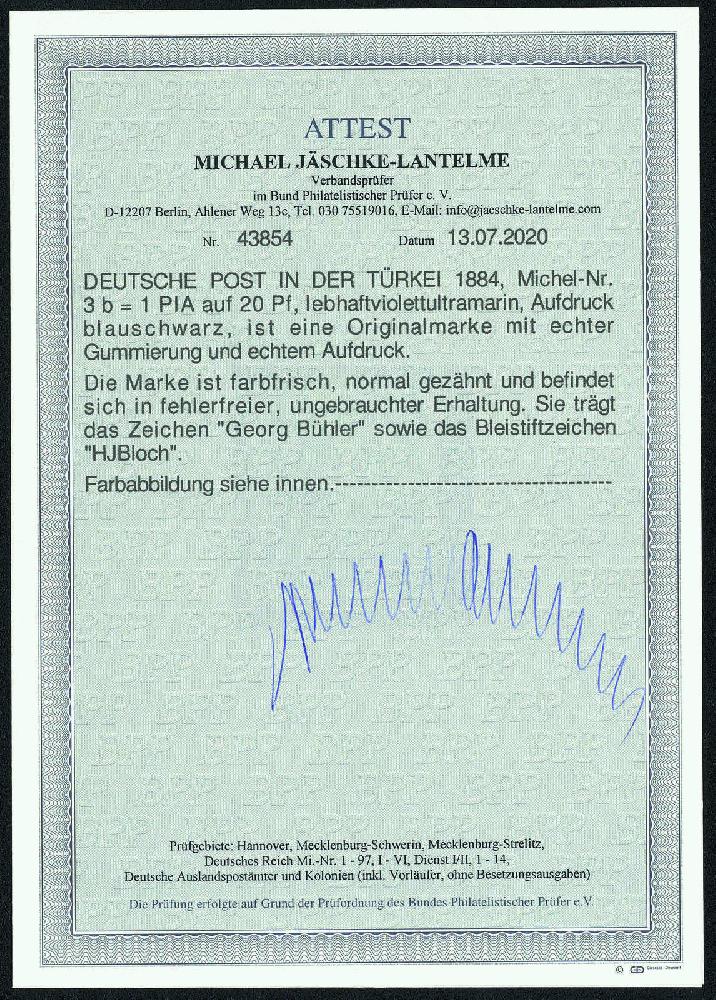 | Zusatzinformationen und Suchstichworte: | Gert Müller 119. Auktion 24. - 26. August 2023 Los 4365 Deutsche Auslandspost Türkei 1 Pia. auf 20 Pfg. lebhaftviolettultramarin, Aufdruck blauschwarz, herrlich farbfrisches, hervorragend zentriertes ungebrauchtes Kabinettstück dieser sehr seltenen Aufdruckfarbe mit Originalgummierung. Es sind nur wenige Exemplare in tadelloser Qualität bekannt geworden, die zu den Seltenheiten der Deutschen Auslandspostämter zählen! Fotoattest "FEHLERFREIE ERHALTUNG" Jäschke-Lantelme BPP Ausruf 1.500,00 EUR |