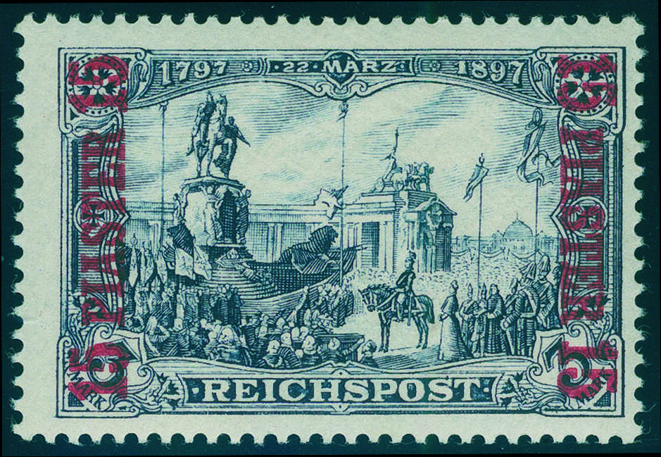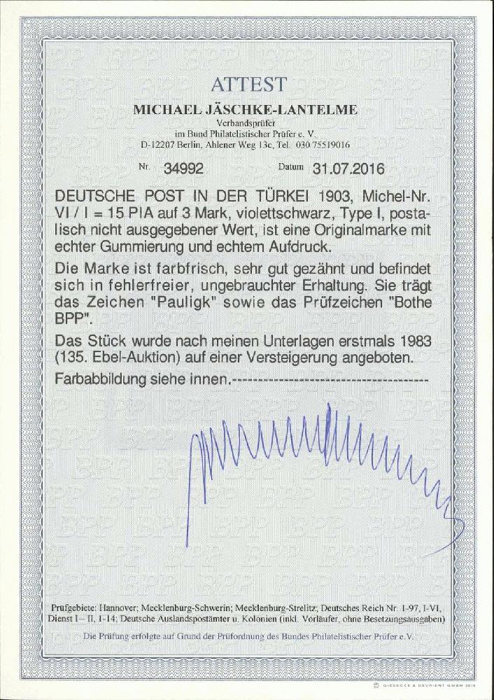 | Zusatzinformationen und Suchstichworte: | Gert Müller 119. Auktion 24. - 26. August 2023 Los 4376 Deutsche Auslandspost Türkei 15 Piaster auf 3 Mk. violettschwarz, Urmarke in Type I, wundervoll farbfrisch und sehr gut gezähnt mit Originalgummierung, nahezu postfr. wirkend. Von dieser unverausgabten Marke sind nur wenige Exemplare bekannt geworden, die zu den ganz großen Raritäten der Deutschen Auslandspostämter zählen. Eines der schönsten bekannten Exemplare für höchste Ansprüche! Fotoattest "FEHLERFREIE ERHALTUNG" Jäschke-Lantelme BPP Ausruf 8.000,00 EUR |