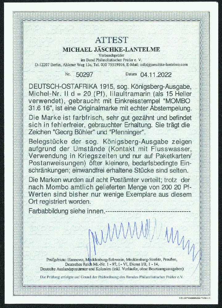 | Zusatzinformationen und Suchstichworte: | Gert Müller 119. Auktion 24. - 26. August 2023 Los 2634 Deutsche Kolonien Ostafrika VERWENDUNG IN MOMBO: 20 Pfg. lilaultramarin, die sogenannte "KÖNIGSBERG-AUSGABE", wundervoll farbfrisch und sehr gut gezähnt, besonders schön zentrisch sauber gest. "MOMBO 31.6.16.". Obwohl das Postamt in Mombo 200 Exemplare der 20 Pfg. erhielt sind nur ganz wenige Stücke mit dieser Abstempelung bekannt geworden. Bei diesem Stück handelt es sich um eines der schönsten bekannten Exemplare. Luxus! Fotoattest "FEHLERFREIE ERHALTUNG" Jäschke-Lantelme BPP Zuschlag 4.200,00 EUR |