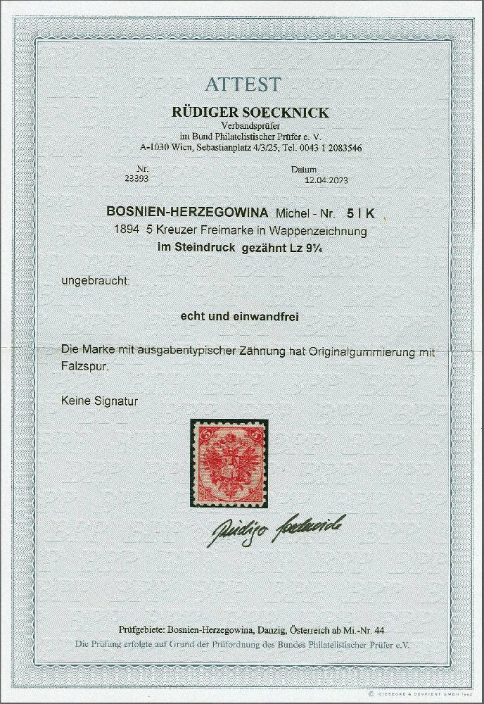 | Zusatzinformationen und Suchstichworte: | Corinphila Veilingen 257. Auktion 13. - 16. September 2023 Los 17 Bosnien Herzegowina Wappen Ausgabe 1879-1895,5 Kreuzer rot lithographische Druck gezähnt 9¼, sehr fein, mit Falz mit 2023 Rüdiger Soecknick Attest, Katalog v. 2250 Ausruf 400,00 EUR |
