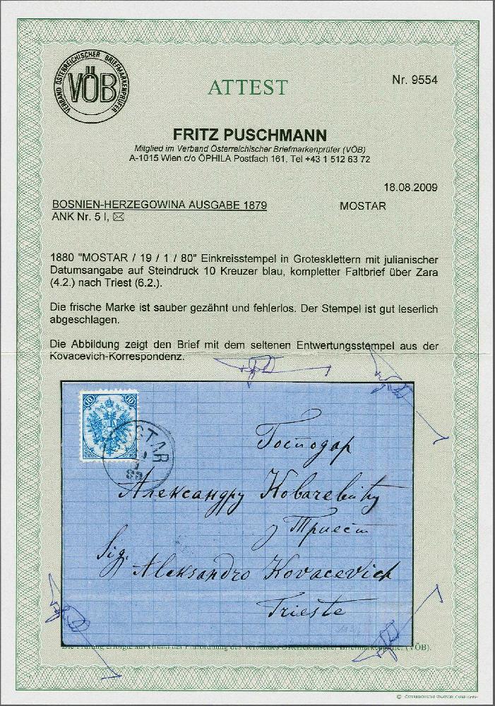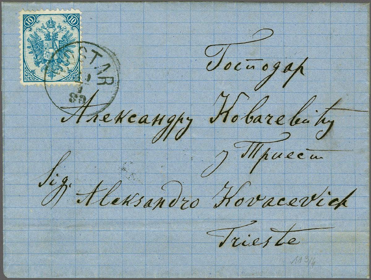 | Zusatzinformationen und Suchstichworte: | Corinphila Veilingen 257. Auktion 13. - 16. September 2023 Los 21 Bosnien Herzegowina Wappen Ausgabe 1879-1895,10 Kreuzer blau lithographische Druck mit dem selten Mostar Kreisdatumsstempel auf vollständiger Brief 19-1-1880 über Zara nach Triest, Pracht mit 2009 Fritz Puschmann Attest Ausruf 200,00 EUR |