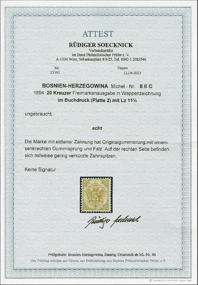 | Zusatzinformationen und Suchstichworte: | Corinphila Veilingen 257. Auktion 13. - 16. September 2023 Los 32 Bosnien Herzegowina Coat of Arms Issue 1879-1895, 20 kreuzer olive typographic printing perforated 11½, fine/very fine with 2023 Rüdiger Soecknick certificate: Die Marke mit seltener Zahnung hat Originalgummierung mit einem senkrechten Gummisprung und Falz. Auf der rechten Seite befinden sich teilweise gering verkürzte Zahnspitzen, cat.v. 1260 Ausruf 200,00 EUR |
