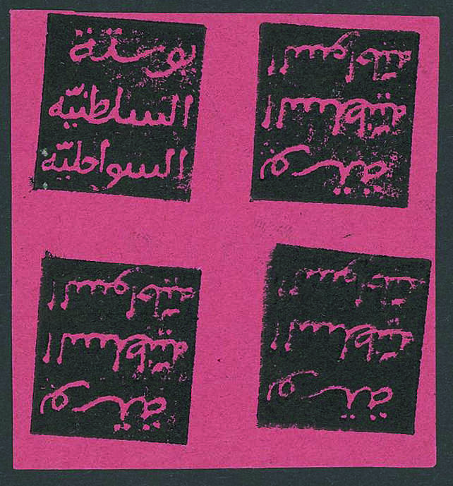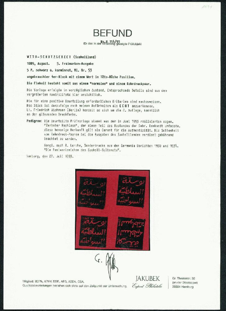 | Zusatzinformationen und Suchstichworte: | Gert Müller 119. Auktion 24. - 26. August 2023 Los 4601 Deutsche Kolonien Witu Schutzgebiet 5 P. schwarz auf karminrot, 1889, ein wundervoller Viererblock inklusive eines Kehrdruckpaares, farbfrisch, allseits perfekt gerandet, wie verausgabt auf ungummiertem Papier. Bereits normale Viererblocks sind sehr selten. In Verbindung mit dem Kehrdruckpaar handelt es sich um eine bedeutende Rarität dieses Gebietes. Im Michel-Spezialkatalog nicht verzeichnet! Fotoattest Jakubek Ausruf 1.500,00 EUR |