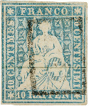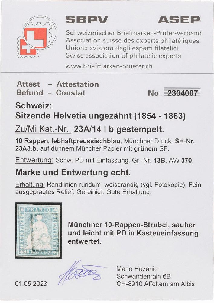 | Zusatzinformationen und Suchstichworte: | Eppli Münzen, Medaillen, Briefmarken, Historika 24. Juni 2023 Los 1018 Schweiz Schweiz - 1854/63, 10 Rappen lebhaftpreussischblau, sitzende Helvetia, ungezähnt, Münchner Druck, auf dünnem Münchner Papier, grüner Seidenfaden, Entwertung durch schwarzen "PD" Stempel, aktueller Befund Huzanic (5/2023), gute Erhaltung, gereinigt, Zumstein / Michel Nummer 23A/14Ib, Michelwert: 550 Euro Zuschlag 50,00 EUR |