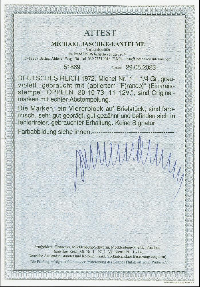 | Zusatzinformationen und Suchstichworte: | 382. Auktion Heinrich Köhler 18. – 23. September 2023 Los 2220 1872, Kleiner Schild ¼ Gr. grauviolett im Viererblock, farbfrisch und sehr gut geprägt und gut gezähnt, sauber mit klaren EKr. "OPPELN 20 10 73" auf Briefstück, tadellos, eine attraktive Einheit, sign. sowie Fotoattest Jäschke-L. BPP (2023) Ausruf 120,00 EUR |