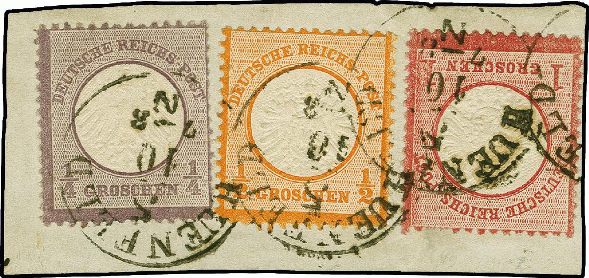 | Zusatzinformationen und Suchstichworte: | 382. Auktion Heinrich Köhler 18. – 23. September 2023 Los 2222 1872, ¼ Groschen violett in Mischfrankatur mit großer Schild ½ Gr. orange und 1 Gr. karmin je mit altem Thurn & Taxis-Stempel "HUENFELD 5.10." auf Briefstück in einwandfreier Erhaltung, dekorative Dreifarben-Mischfrankatur, Fotoattest Sommer BPP (1998) Ausruf 100,00 EUR |