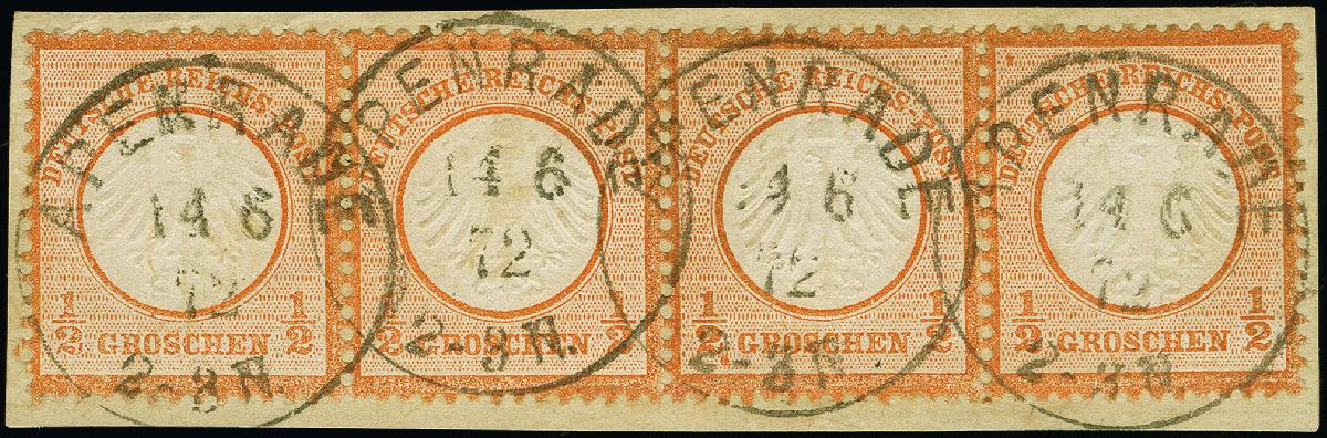 | Zusatzinformationen und Suchstichworte: | 382. Auktion Heinrich Köhler 18. – 23. September 2023 Los 2228 ½ Gr. rötlichorange im waagerechten Viererstreifen, farbfrisch und gut gezähnt, saube rmit EKr. "APENRADE 14 6 72" auf Briefstück, tadellos, sign. Fa Köhler sowie Fotoattest Jäschke-L. BPP (2023) Ausruf 160,00 EUR |