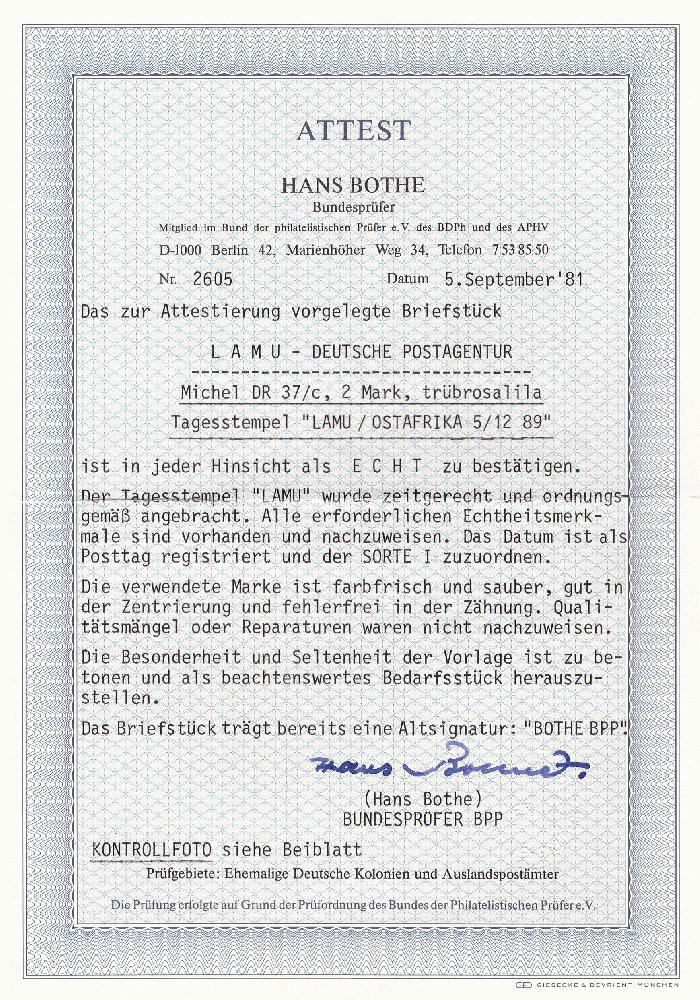 | Prüfgebiet: | Deutsche Auslandspostämter Lamu |