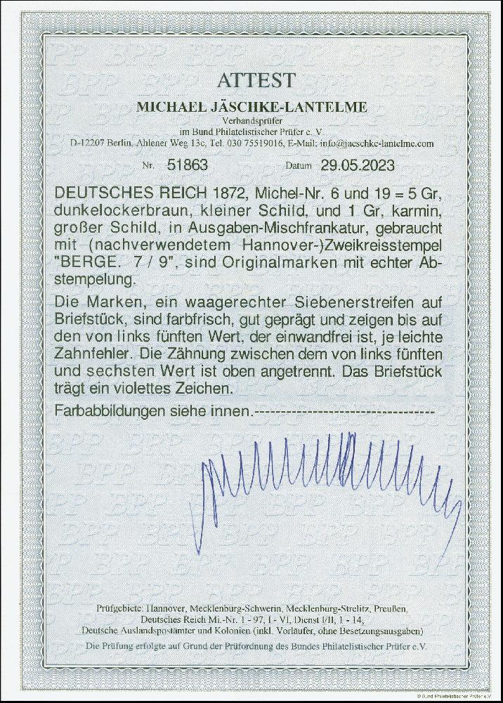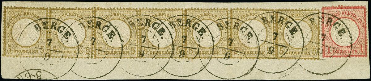 | Zusatzinformationen und Suchstichworte: | 382. Auktion Heinrich Köhler 18. – 23. September 2023 Los 2233 1872, Kleiner Schild 5 Gr. dunkelockerbraun im waagerechten Siebenerstreifen in Mischfrankatur mit Großer Schild 1 Gr. rot, hervorragend farbfrisch und gut geprägt, kleine, nicht störende Zahnfehler, an zwei Stellen winzig angetrennt, sauber mit nachverwendetem Hannoverschen DKr. "BERGE. 7/9" auf Briefstück, eine sehr attraktive und seltene Einheit, sign. sowie Fotoattest Jäschke-L. BPP (2023) Ausruf 500,00 EUR |