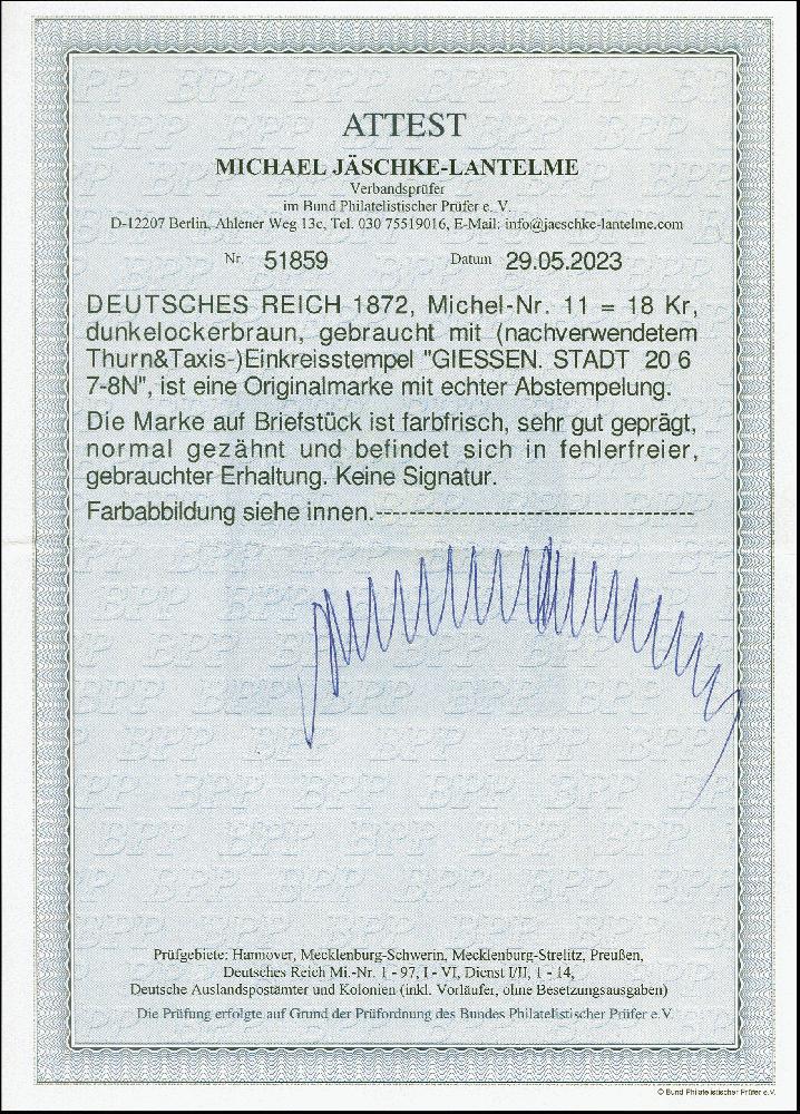 | Zusatzinformationen und Suchstichworte: | 382. Auktion Heinrich Köhler 18. – 23. September 2023 Los 2243 18 Kr. dunkelockerbraun, farbfrisch, sehr gut geprägt und gut gezähnt, sauber mit Thurn und Taxis EKr. "GIESSEN STADT 20 6" auf kleinem Briefstück, tadellos, Fotoattest Jäschke-L. BPP (2023) Ausruf 100,00 EUR |