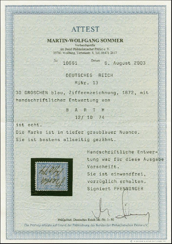 | Prüfer: | Sommer, Martin-Wolfgang (BPP (Bund Philatelistischer Prüfer)) |