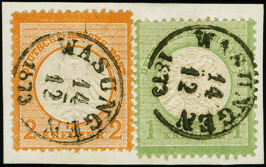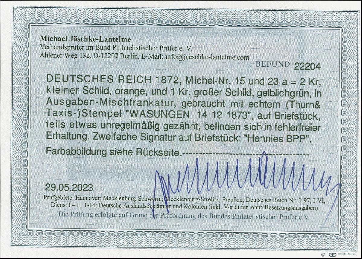 | Zusatzinformationen und Suchstichworte: | 382. Auktion Heinrich Köhler 18. – 23. September 2023 Los 2252 1872, Kleiner Schild 2 Kr. orange in Mischfrankatur mit Großer Schild 1 Kr. gelblichgrün, farbfrisch und gut geprägt, winzig unregelmäßig gezähnt, sauber mit Thurn und Taxis EKr. "WASUNGEN 14 12 1873" auf kleinem Briefstück, tadellos, sign. hennis BPP sowie Befund Jäschke-L. BPP (2023) Ausruf 80,00 EUR |