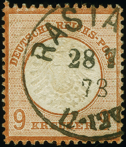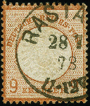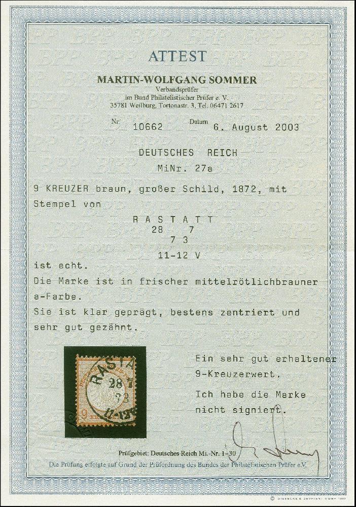 | Zusatzinformationen und Suchstichworte: | 382. Auktion Heinrich Köhler 18. – 23. September 2023 Los 2277 1872, 9 Kr. mittelrötlichbraun mit klarem EKr. "RASTATT 28.7.73" in einwandfreier Erhaltung, Fotoattest Sommer BPP (2003) Ausruf 100,00 EUR |