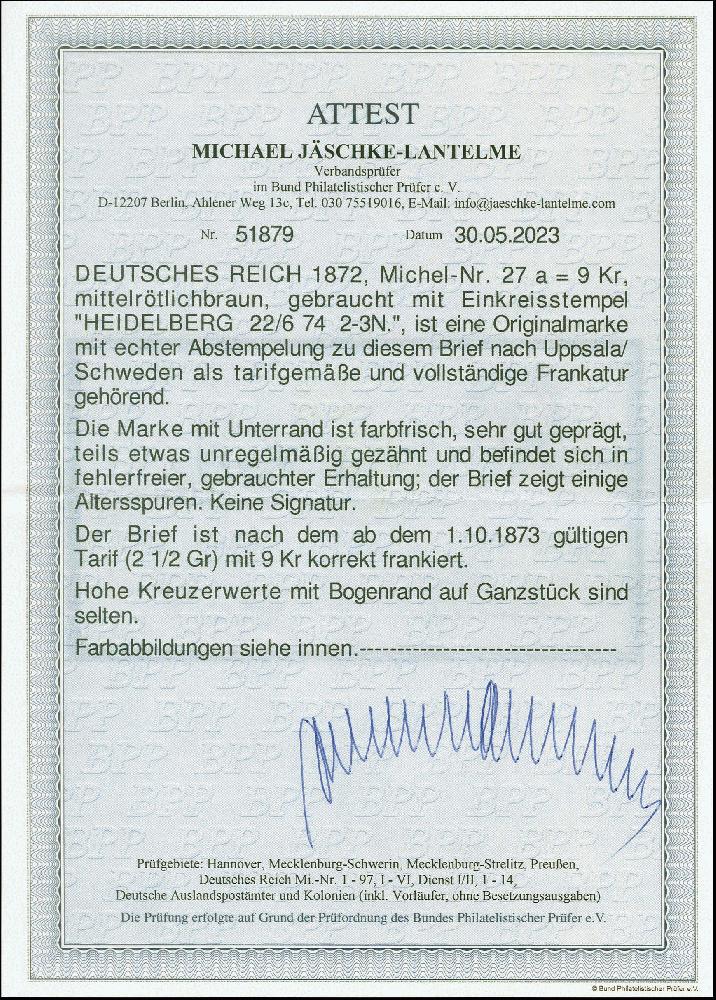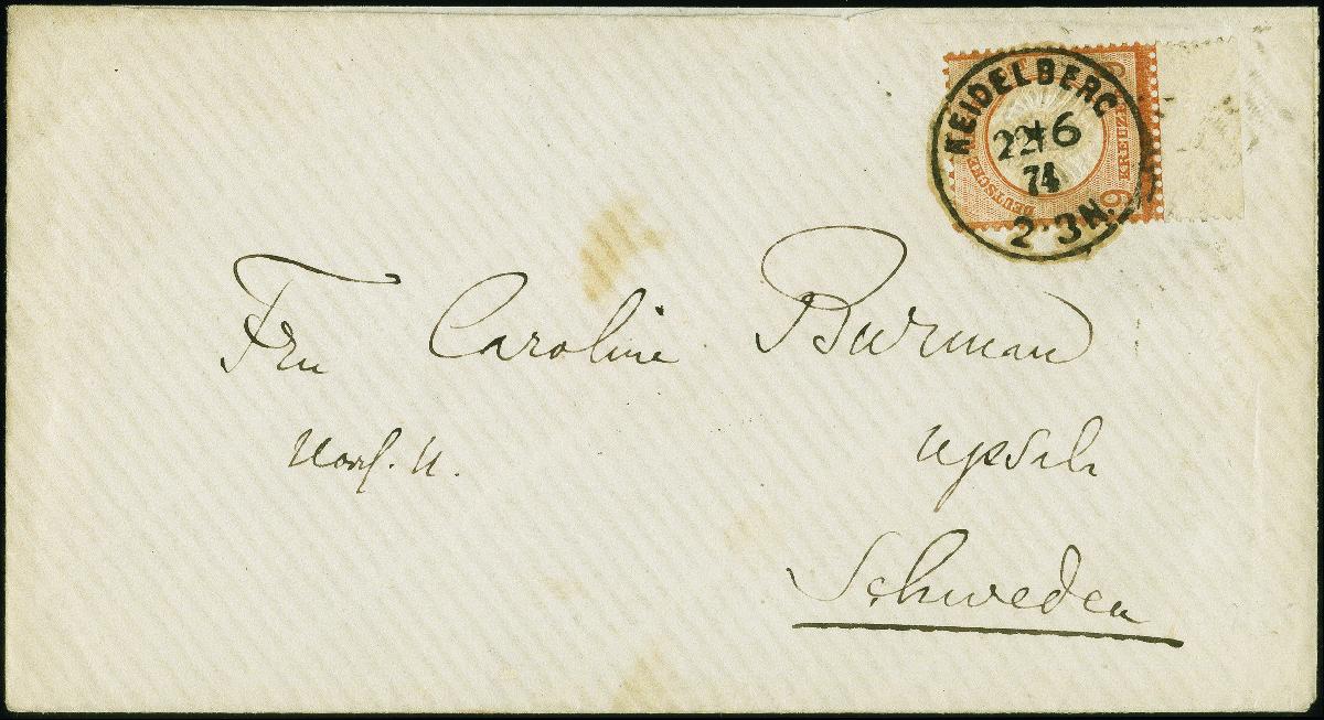 | Zusatzinformationen und Suchstichworte: | 382. Auktion Heinrich Köhler 18. – 23. September 2023 Los 2278 9 Kr. mittelrötlichbraun mit Unterrand, farbfrisch und sehr gut geprägt, winzig unregelmäßig gezähnt, sauber mir EKr. "HEIDELBERG 22/6 74" auf weißem Kuvert nach Uppsala, Schweden, tadellos. Ein sehr schöner Brief, Randstücke der hohen Kreuzerwerte sind auf Ganzsstücken selten, Fotoattest Jäschkel-L. BPP (2023) Ausruf 150,00 EUR |