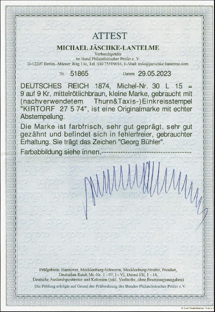 | Zusatzinformationen und Suchstichworte: | 382. Auktion Heinrich Köhler 18. – 23. September 2023 Los 2287 9 auf 9 Kr. braunorange im kleinen Format L15, farbfrisch und sehr gut geprägt sowie gezähnt mit klarem, fast zentrischen Thurn und Taxis EKr. "KIRTORF 27 5 74" entwertet, tadellos, ein sehr schönes Stück, sign. Bühler sowie Fotoattest Jäschke-L. BPP (2023) Ausruf 120,00 EUR |