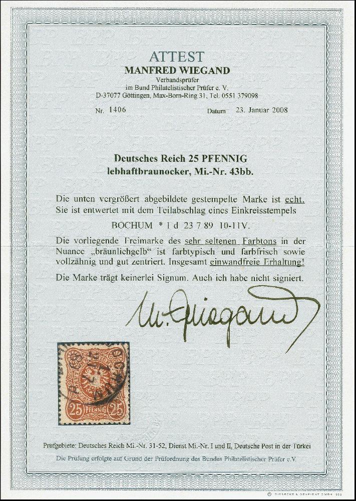 | Zusatzinformationen und Suchstichworte: | 382. Auktion Heinrich Köhler 18. – 23. September 2023 Los 2296 1880, 25 Pfg. lebhaftbraunocker, farbfrisch und gut zentriert sowie gezähnt, sauber gestempelt "BOCHUM 23 7 89", tadellos, ein sehr schönes Stück dieser seltenen Farbe, Fotoattest Wiegand BPP (2008) Ausruf 400,00 EUR |