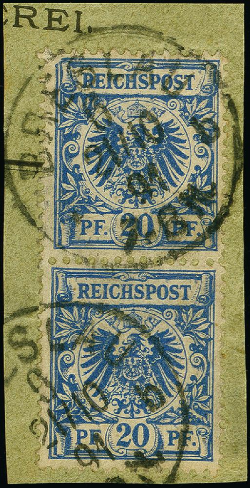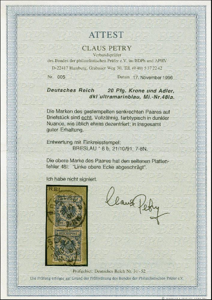 | Zusatzinformationen und Suchstichworte: | 382. Auktion Heinrich Köhler 18. – 23. September 2023 Los 2301 20 Pfg. mittelultramarin im senkrechten Paar, farbfrisch und gut gezähnt, die obere Marke mit markantem Plattenfehler "linke obere Ecke abgeschrägt", sauber mit Stempel "BRESLAU 21/10 91" auf Briefstück, tadellos, Fotoattest Petry BPP (1996) Ausruf 120,00 EUR |