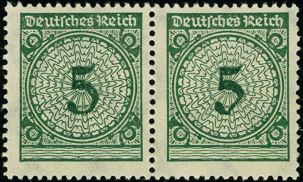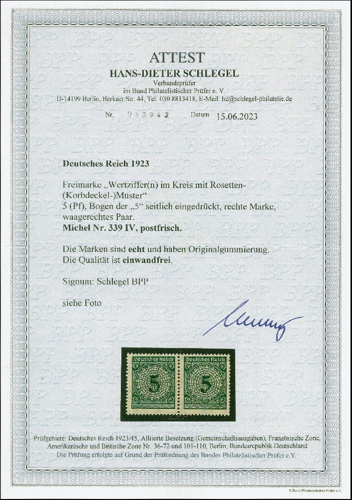 | Zusatzinformationen und Suchstichworte: | 382. Auktion Heinrich Köhler 18. – 23. September 2023 Los 2339 1923, Korbdeckel 5 Pfg. im waagerechten Paar, die rechte Marke mit Abart "Bogen der 5 eingedrückt", postfrisch, tadellos, sign. Schlegel BPP sowie Fotoattest HD Schlegel BPP (2023) Ausruf 120,00 EUR |