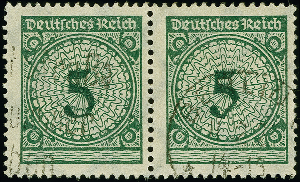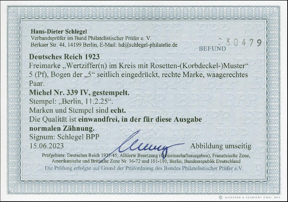 | Zusatzinformationen und Suchstichworte: | 382. Auktion Heinrich Köhler 18. – 23. September 2023 Los 2340 1923, Korbdeckel 5 Pfg. im waagrechten Paar, die rechte Marke mit Abart "eingedrückter Bogen der 5", sauber gestempelt, im Paar besonders attraktiv, ausgabetypisch gezähnt, tadellos, sign. Schlegel BPP mit Befund HD Schlegel BPP (2023) Ausruf 100,00 EUR |
