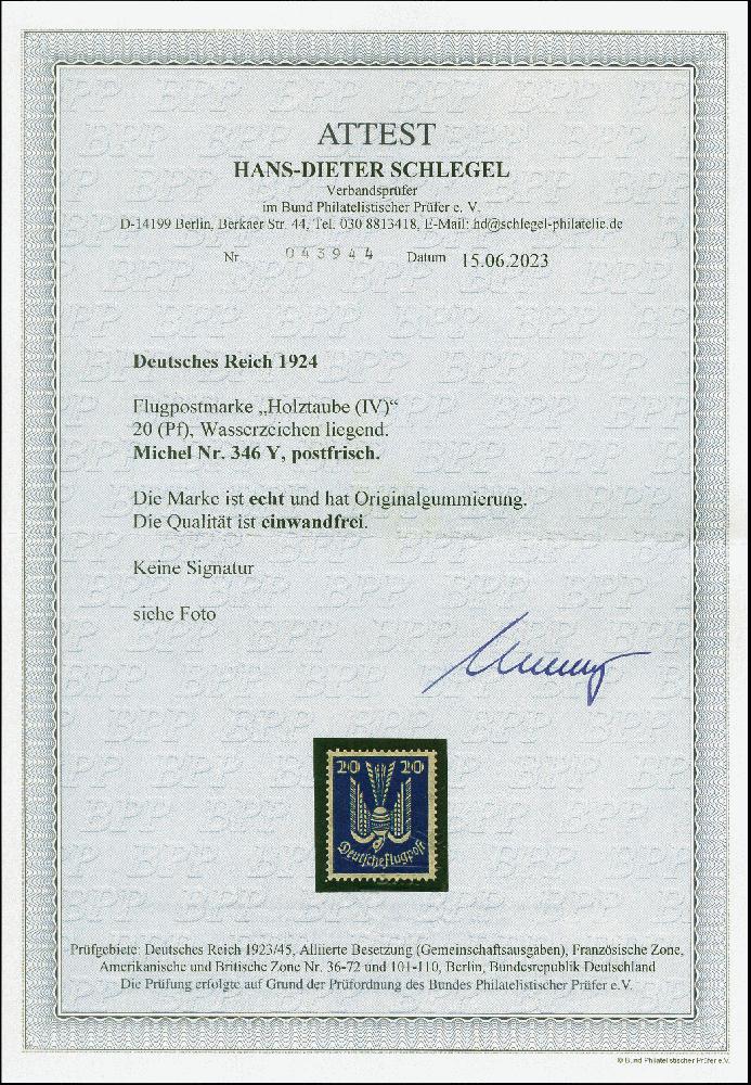 | Zusatzinformationen und Suchstichworte: | 382. Auktion Heinrich Köhler 18. – 23. September 2023 Los 2342 1924, Holztaube 20 Pfg. mit liegendem Wasserzeichen, postfrisch, tadellos, Fotoattest HD Schlegel BPP (2023) Ausruf 150,00 EUR |