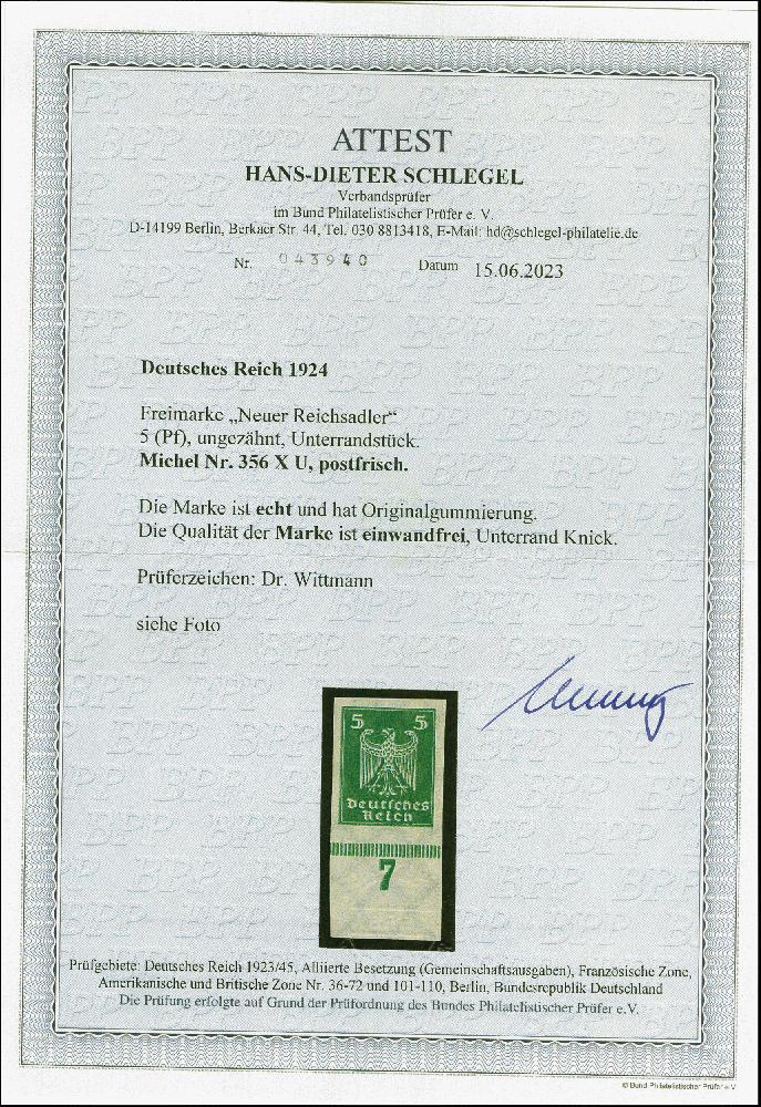 | Zusatzinformationen und Suchstichworte: | 382. Auktion Heinrich Köhler 18. – 23. September 2023 Los 2344 1924, Reichsadler 5 Pfg., allseits breitrandig ungezähntes Unterrandstück, postfrisch, tadellos, waagerechter Bug im weiten Unterrand, sign. Wittmann sowie Fotoattest HD Schlegel BPP (2023) Ausruf 100,00 EUR |