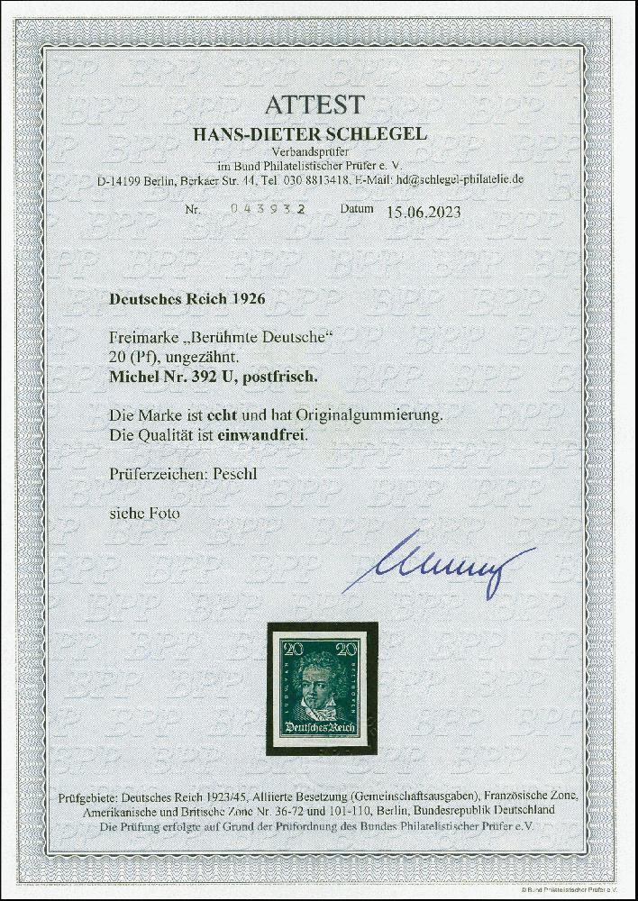 | Zusatzinformationen und Suchstichworte: | 382. Auktion Heinrich Köhler 18. – 23. September 2023 Los 2351 1928, Berühmte Deutsche 20 Pfg., allseits breitrandig ungezähnt, postfrisch, tadellos, eine seltene Marke, sign. Peschl sowie Fotoattest HD Schlegel BPP (2023) Ausruf 500,00 EUR |