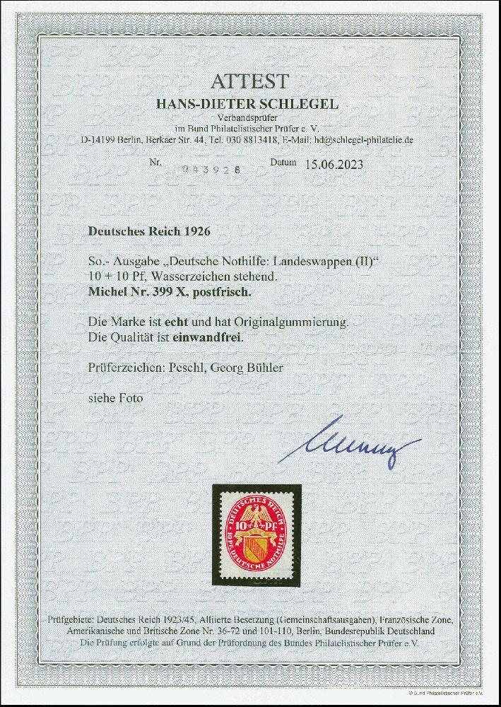 | Zusatzinformationen und Suchstichworte: | 382. Auktion Heinrich Köhler 18. – 23. September 2023 Los 2352 1926, Nothilfe 10 Pfg. mit stehenden Wasserzeichen, postfrisch, tadellos, u.a. sign. Peschl sowie Fotoattest HD Schlegel BPP (2023) Ausruf 400,00 EUR |