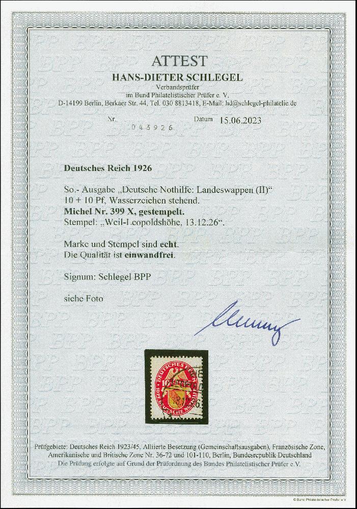 | Zusatzinformationen und Suchstichworte: | 382. Auktion Heinrich Köhler 18. – 23. September 2023 Los 2353 1926, Nothilfe 10 Pfg. mit stehenden Wasserzeichen, sauber gestempelt "WEIL-LEOPOLDSHÖHE 13.12.26", tadellos, sign. Schlegel BPP mit Fotoattest HD Schlegel BPP (2023) Ausruf 250,00 EUR |