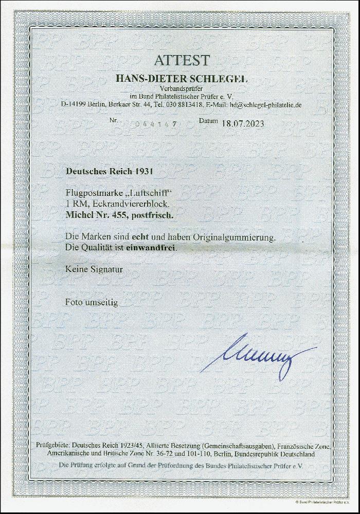 | Zusatzinformationen und Suchstichworte: | 382. Auktion Heinrich Köhler 18. – 23. September 2023 Los 2368 1931, Zeppelin 1 M. im Viererblock aus der rechten unteren Bogenecke, postfrisch, tadellos, unsigniert mit Fotoattest D. Schlegel BPP (2023) Ausruf 100,00 EUR |