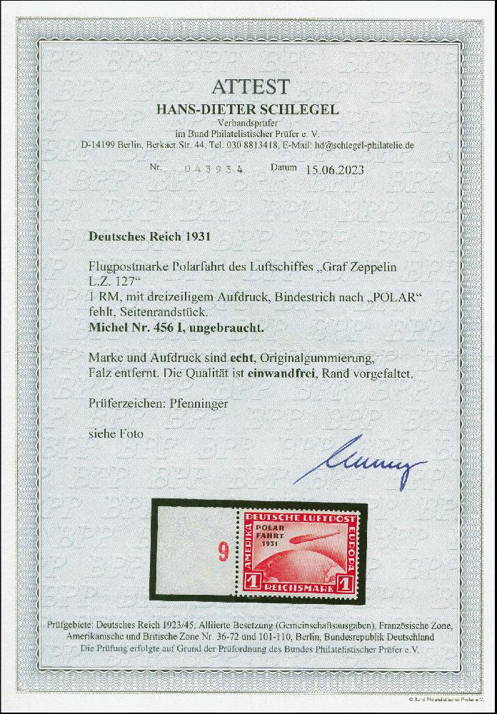 | Zusatzinformationen und Suchstichworte: | 382. Auktion Heinrich Köhler 18. – 23. September 2023 Los 2371 1931, Polarfahrt 1 M., linkes Seitenrandstück mit Aufdruckfehler "ohne Bindestrich nach POLAR", sauber ungebraucht, tadellos, sign. Pfenninger sowie Fotoattest HD Schlegel BPP (2023) Ausruf 120,00 EUR |