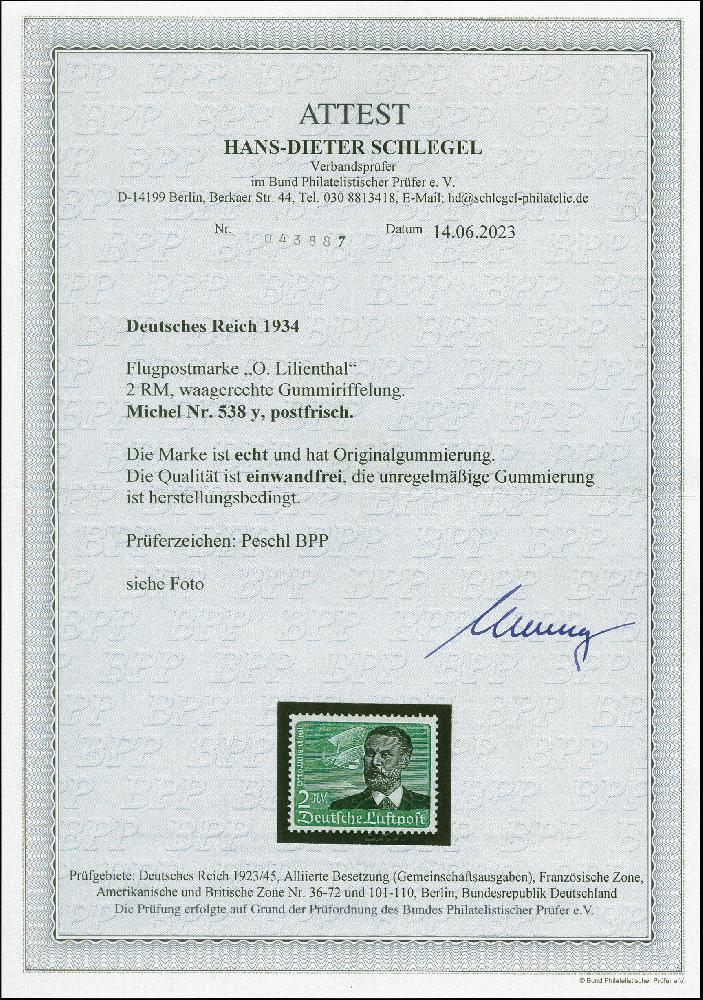 | Zusatzinformationen und Suchstichworte: | 382. Auktion Heinrich Köhler 18. – 23. September 2023 Los 2391 1934, Flugpost 2 M. mit waagerechter Gummiriffelung, postfrisch, tadellos mit üblicher Gummierung, sign. Peschl BPP sowie Fotoattest HD Schlegel BPP (2023) Ausruf 700,00 EUR |