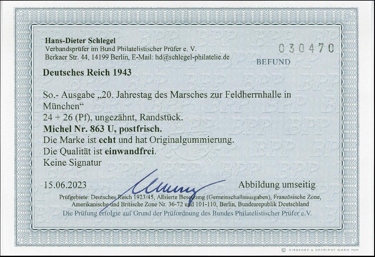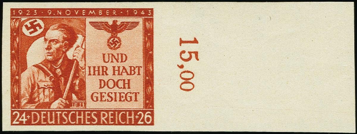 | Zusatzinformationen und Suchstichworte: | 382. Auktion Heinrich Köhler 18. – 23. September 2023 Los 2438 1943, Hitlerputsch 24 Pfg., ungezähntes rechtes Randstück mit breitem Rand, postfrisch, tadellos, Befund HD Schlegel BPP (2023) Ausruf 80,00 EUR |