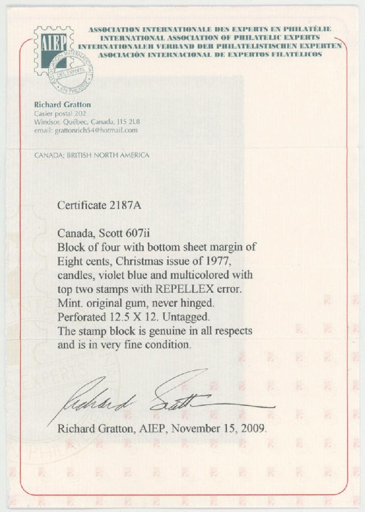 | Zusatzinformationen und Suchstichworte: | Raritan Stamps - 97. Auktion 30. - 31. August 2023 Los 446 Canada 1972, Weihnachtsausgabe, Kerzen, 8c mehrfarbig, unten Seitenrand-Viererblock mit repellex Fehler (zwei obere Marken mit Hintergrund in blau statt tiefviolett), vollständiger Originalgummi, postfrisch, Pracht und seltene Einheit, R. Gratton Attest, Unitrade #607ii, Katalogwert CAD$1,000 als zwei senkrechte Paare Ausruf 250,00 USD |