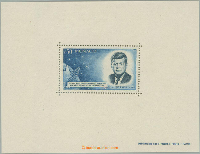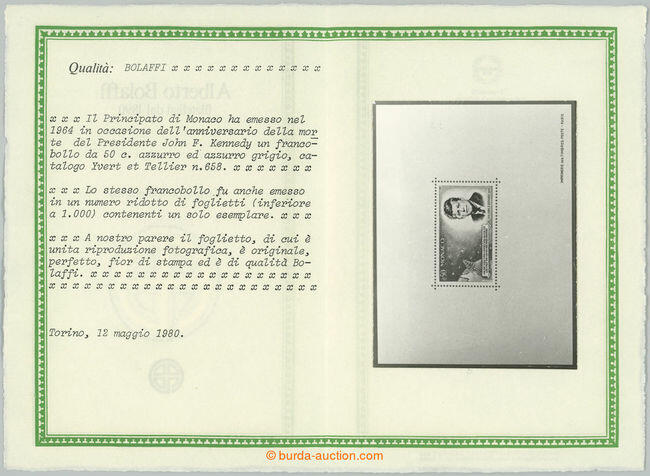 | Zusatzinformationen und Suchstichworte: | Burda 72. Auktion 16. - 17. September 2023 Los 121 Monaco 1964 Mi. 789Bl, Yv. 658, Kleinbogen Kennedy 0, 50Fr gezähnt + ungezähnt Briefmarke; Pracht, Attest Bolaffi, c. v. Yvert 800EUR + + Ausruf 171,00 EUR |