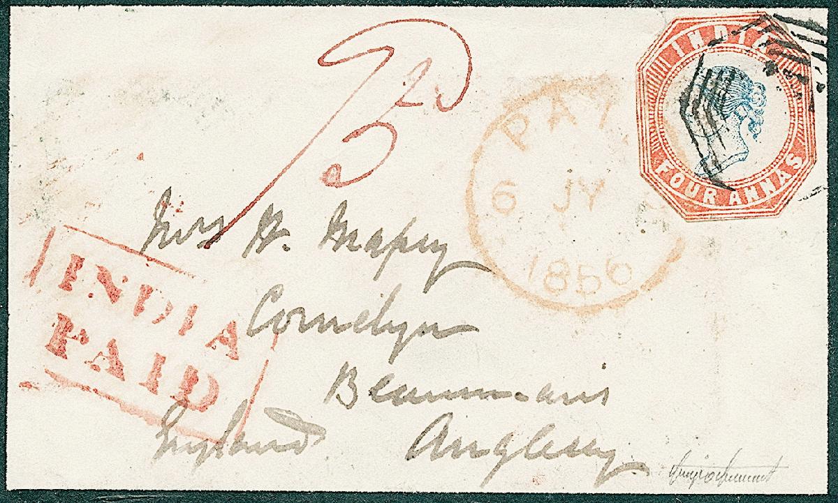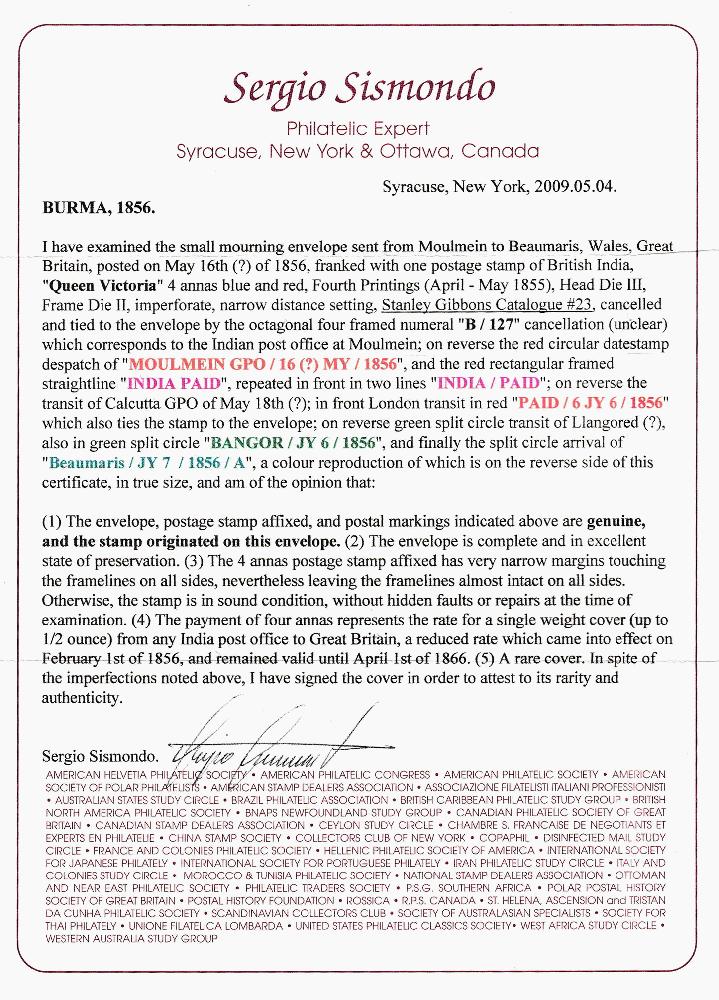 | Zusatzinformationen und Suchstichworte: | Robert A. Siegel - The Magnolia Collection: India Postal History & Stamps Used Abroad 11. Mai 2023 Los 214 Birma Gebraucht in Burma, 1854,4a rot und blau, 4. Druck, Kopf Die III, Rahmen Platte II (6F; SG 23). Auf Form geschnitten, schmalrandig bis berührt außen Randlinie, entwertet mit leichter Abschlag von "B/127" Stempel auf Trauerbrief zu Beaumaris, Wales, Moulmein Mai 1856 Kreisdatumsstempel auf Rückseite, rot "Indien gezahlt" Handstempel, Kalkutta, London (sowie übergehend Briefmarke) und Bangor Durchgangs, Beaumaris Datumsankunftsstempel, Pracht, mit 2009 Sismondo Attest - - ein weiterer Trauerbrief ab dieses Korrespondenz ist angeboten in Los 216 Ausruf 1.000,00 USD |