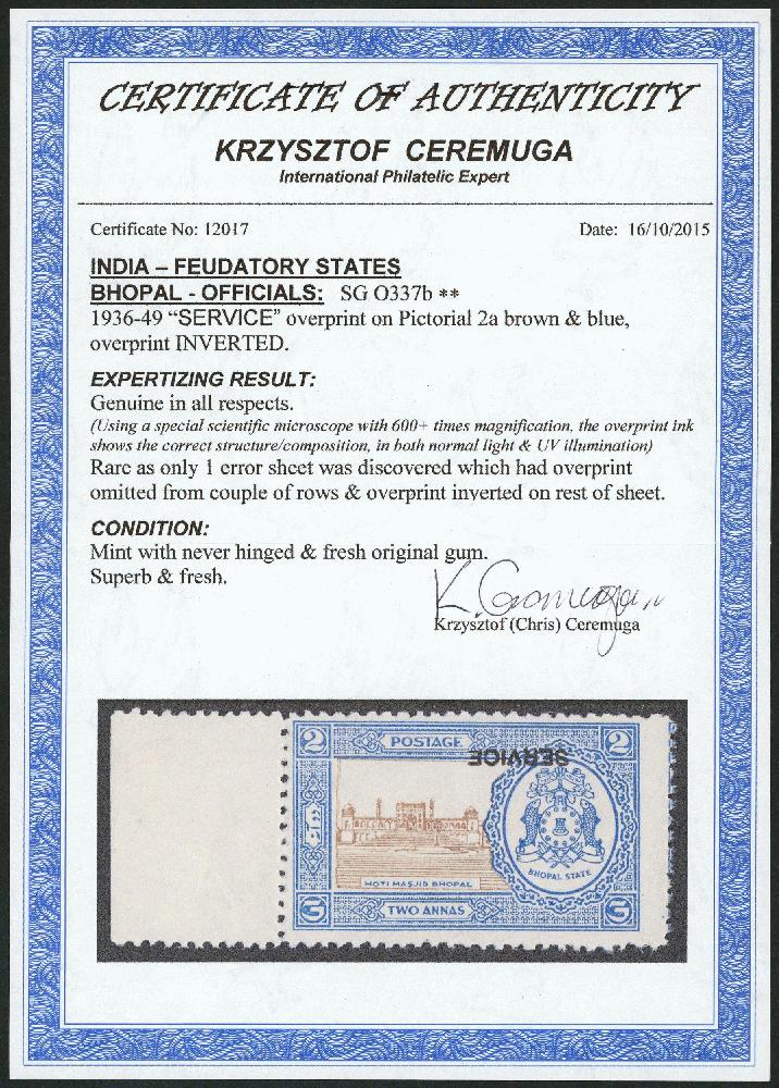 | Zusatzinformationen und Suchstichworte: | Stanley Gibbons - Briefmarken und Belege der Welt 23. - 24. August 2023 Los 379 Indien Staaten Bhopal Dienst. 1937 2a braun und blau linker Rand, postfrisch Originalgummi, Überdruck kopfstehend. Ceremuga Attest (2015). SG O337b, £200 (150,- Schätzpreis GBP) Ausruf 110,00 GBP |