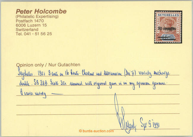 | Zusatzinformationen und Suchstichworte: | Burda 72. Auktion 16. - 17. September 2023 Los 763 Seychellen 1901 SG. 38b, Victoria 3C/16C, doppelter Aufdruck; Pracht, signiert Herbert Bloch und Attest Holcombe, c. v. £500 Ausruf 320,00 EUR |
