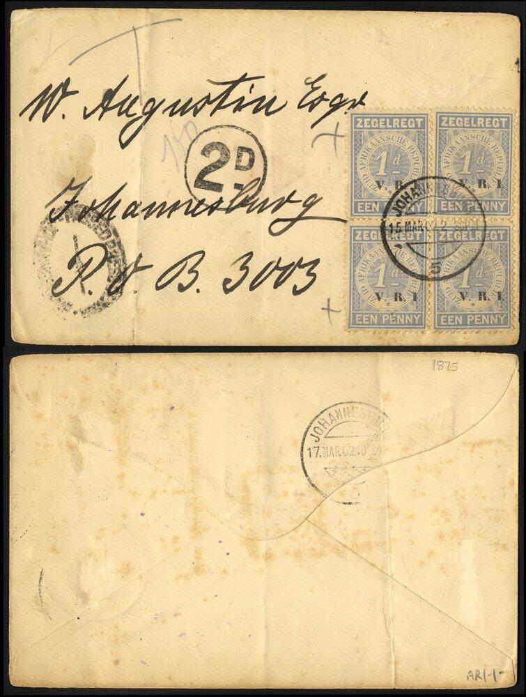 | Zusatzinformationen und Suchstichworte: | Corbitts 172. Briefmarken Auktion 31. August 2023 Los 932 Transvaal 1902 (15 Mar) taxiert Briefpost Ortsbrief mit 1901 Revenue 1d Viererblock überdruckt V. R. I zentrisch entwertet durch Johannesburg 5 c. d. S, aber verweigert, mit handschriftlich T mit Kreistempel eingerahmt 2D und Presse Zensurstempel, BPA Attest 1993 Ausruf 130,00 GBP |