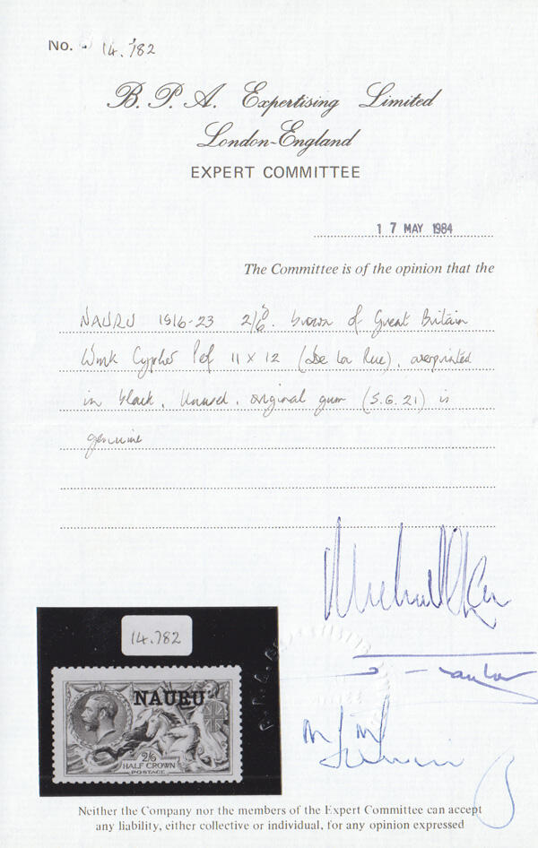 | Zusatzinformationen und Suchstichworte: | Kelleher #2005 Auktion 7. - 9. August 2023 Los 1129 Nauru 1916, König Georg V "Seepferdchen", 2s 6d braun, De La Rue Druck (Scott 13), Originalgummi, postfrisch, feinst bis Pracht, mit 1984 B. P. A. Attest. SG 21; £80 für gefalzt ($100). Scott $80 für gefalzt Zuschlag 70,00 USD |