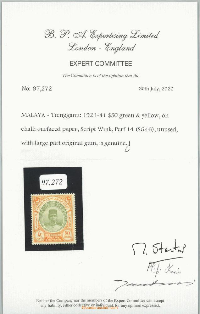 | Zusatzinformationen und Suchstichworte: | Burda 72. Auktion 16. - 17. September 2023 Los 1131 Malaiische Staaten allgemein 1921-1941 SG. 46, Sultan Suleiman $50 grün/gelb; sehr schönes Stück mit großem Teil Originalgummi, Attest BPA London, c. v. £3,500, seltene Marke! Ausruf 1.873,00 EUR |
