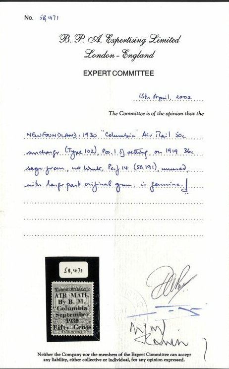 | Zusatzinformationen und Suchstichworte: | Corbitts 172. Briefmarken Auktion 31. August 2023 Los 711 Neufundland 1930 Kolumbien Luftpost 50c Aufdruck auf 1919 36c Salbeigrün, M, Pracht. Selten. (1) SG. 191, Katalog £6000, BPA Attest 2002 Bundesländer Position. 1 von Fassung. Philatelic Foundation Attest (New York, 1950) sowie begleitet Ausruf 2.000,00 GBP |