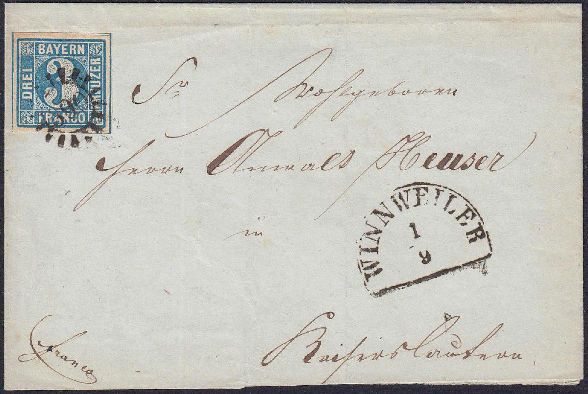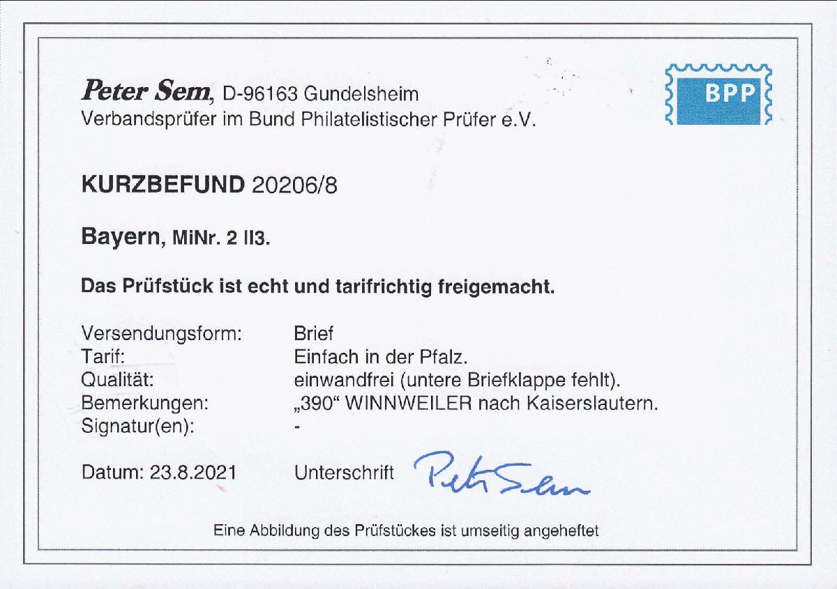 | Zusatzinformationen und Suchstichworte: | 203. Auktionshaus Schulz Auktion 17. August 2023 Los 3166 Altdeutschland Bayern "390" WINNWEILER, guter MR.-Stempel klar nebst Segment auf Faltbrief mit breitrandiger 3 Kr. blau, Befund Sem "einwandfrei, untere Briefklappe fehlt) (Alter Ausrufpreis: 80 EUR) GEBOT |