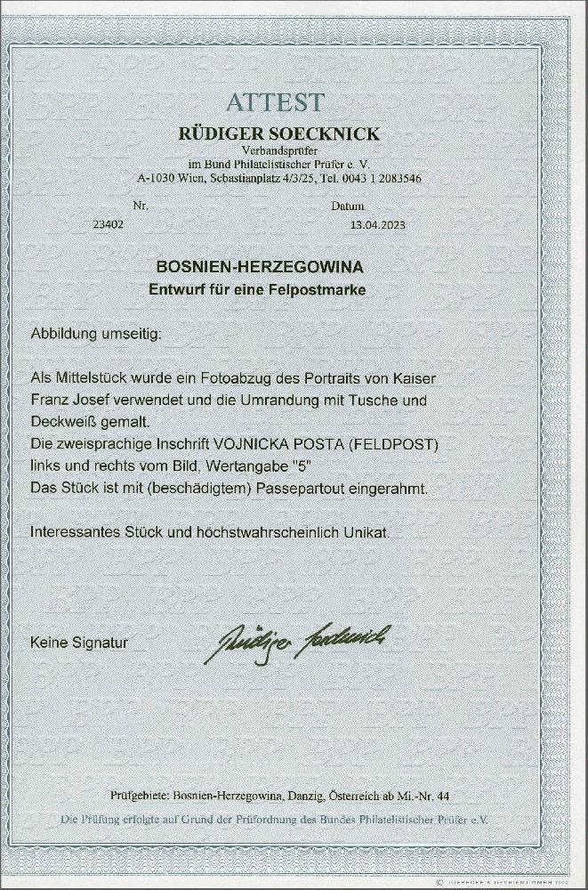 | Zusatzinformationen und Suchstichworte: | Corinphila Veilingen 257. Auktion 13. - 16. September 2023 Los 404 Bosnien Herzegowina Entwurf für ein nicht verausgabt Feldpostmarke mit ein Porträt von Franz Joseph, Ziffer 5 und Vojnicka Posta (Etappenpost) auf lateinisch und kyrillisch schreibend, ungefähres Maß 16facher 10 cm und Rechteck im Passepatout, fein/Pracht mit 2023 Rüdiger Soecknick Attest. Ein hochinteressant und wahrscheinlich ein Unikat Artikel! Ausruf 500,00 EUR |