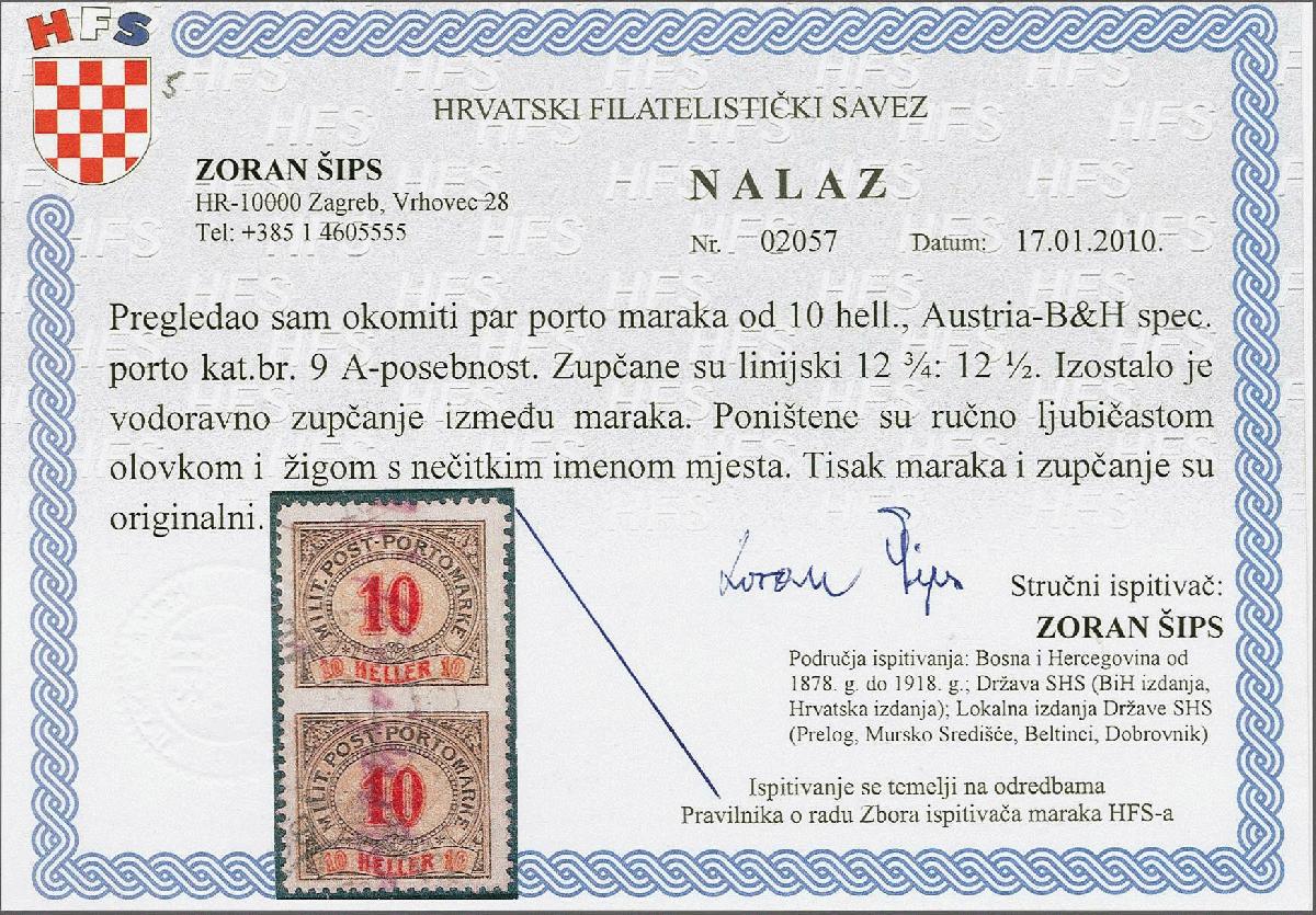 | Zusatzinformationen und Suchstichworte: | Corinphila Veilingen 257. Auktion 13. - 16. September 2023 Los 337 Bosnien Herzegowina 10 heller im waagrechten Paar mit Abart ungezähnt zwischen mit 2010 Zoran schlürft Attest, fein/Pracht Ausruf 80,00 EUR |